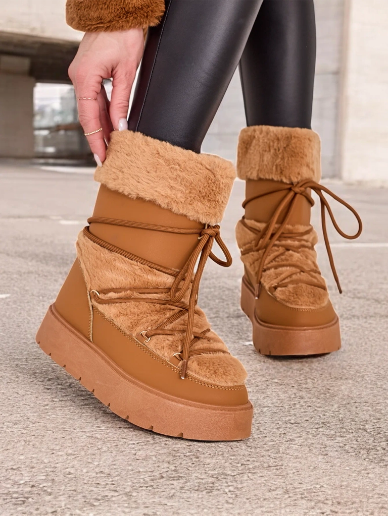 - Bocanci pentru femei de tip zăpadă cu un șaft făcut dintr-o combinație de eco-piele și material plăcut. În interior, există o căptușeală plăcută din blană, încălțămintea are un șaft înnodat. Perfect pentru iarnă!