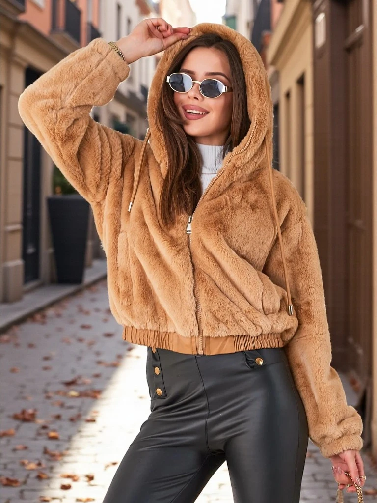 - Geaca unica pentru femei, confectionata dintr-un material placut si moale, asemanator cu blana. Modelul are o gluga, 2 buzunare si se inchide cu fermoar. Hit-ul acestei sezoane!