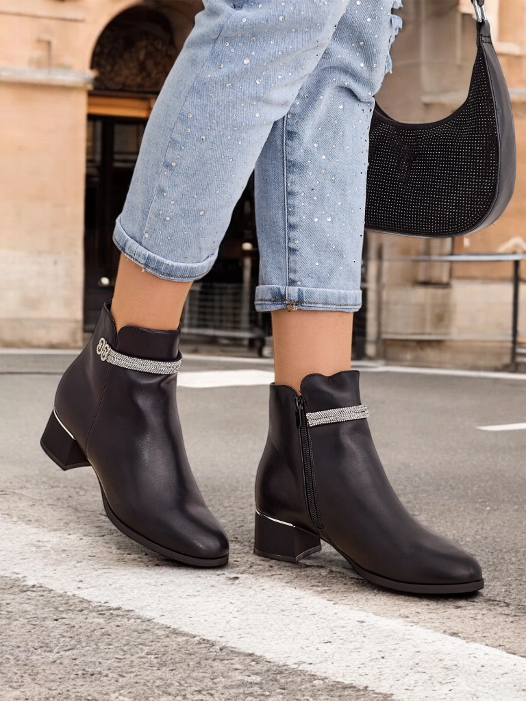 - Ghete frumoase pentru femei cu toc mic, realizate din piele ecologică patentată. Interiorul este căptușit cu blană delicată. Modelul este închis cu un fermoar. Au o decorație cu zirconiu. Perfecte pentru ținutele de toamnă!