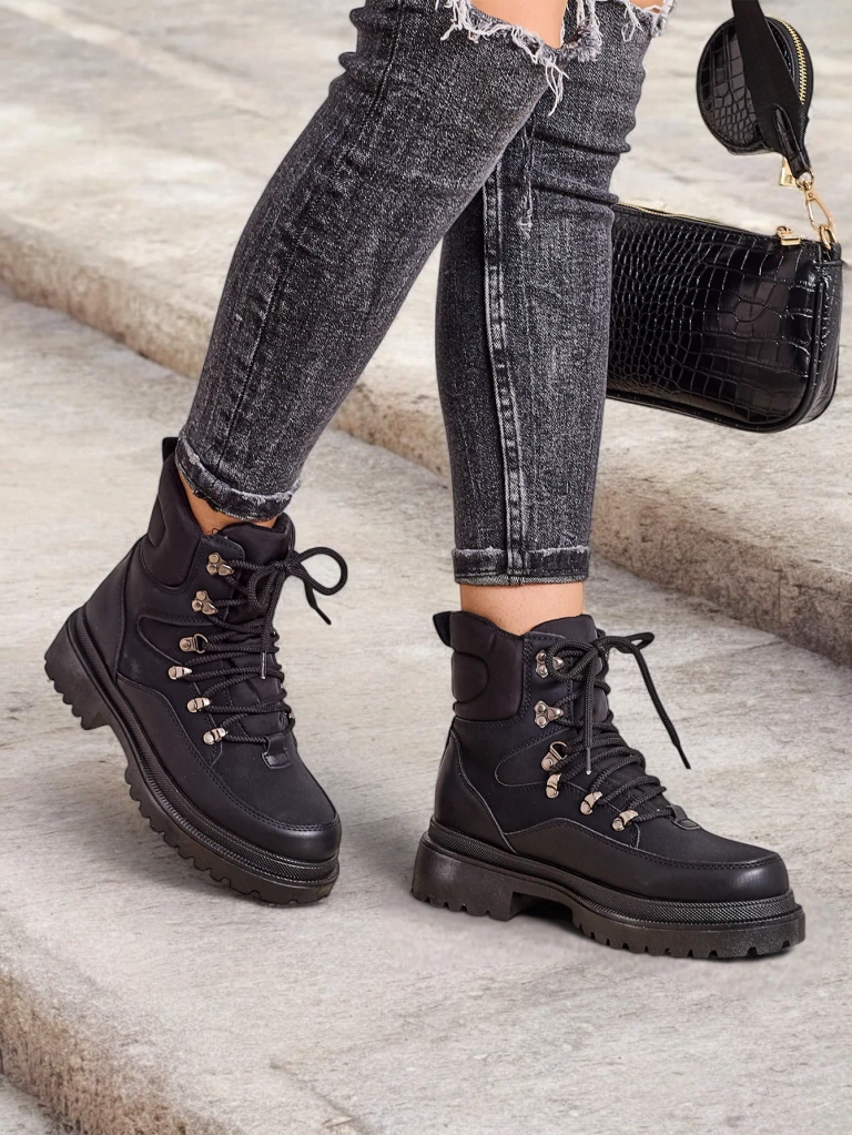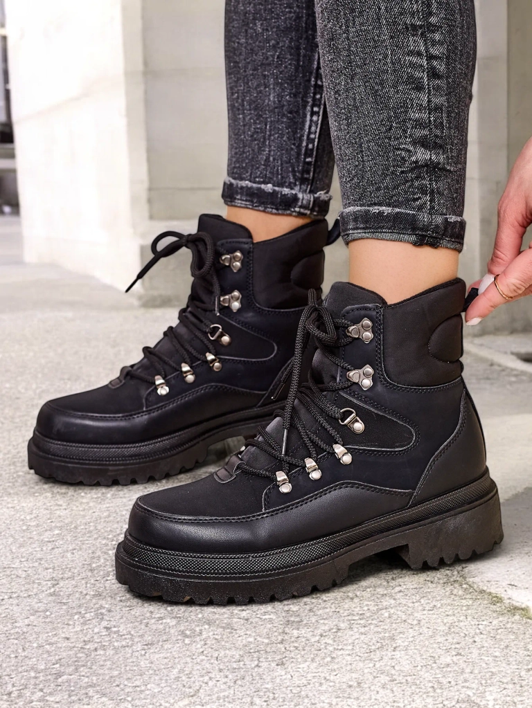 • Bocanci trapper unici pentru femei, fabricati dintr-o combinatie de piele ecologica, piele ecologica mata si material textil. Modelul are partea superioara trasa cu sireturi. Umpluti cu spuma mai groasa si material textil in interior. Incaltaminte specifi