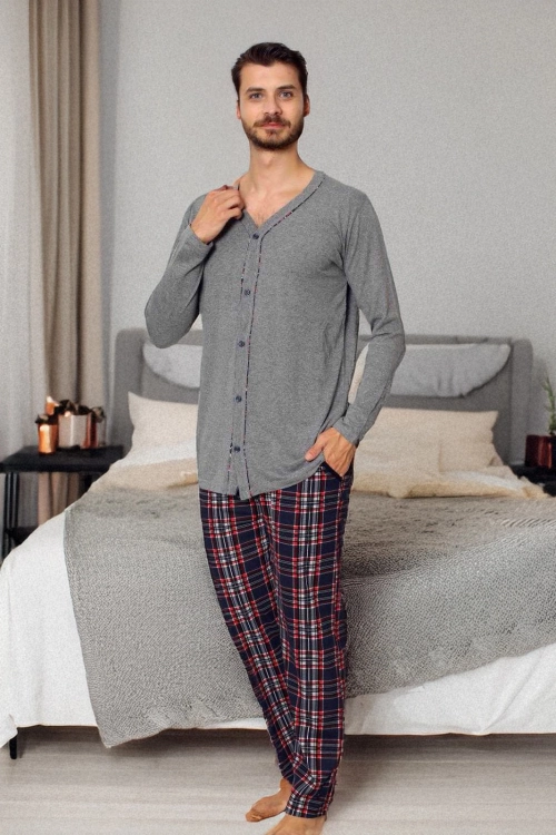 - Pijamale de excepție pentru bărbați, fabricate din material de bumbac. Modelul are mâneci și pantaloni lungi. Partea de sus este încheiată cu nasturi. Confort și eleganță într-un singur produs!