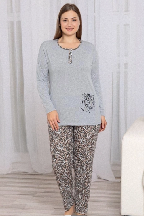 Royalfashion Pijamale gri pentru femei, din 2 piese, cu imprimeu leopard Mărime plus