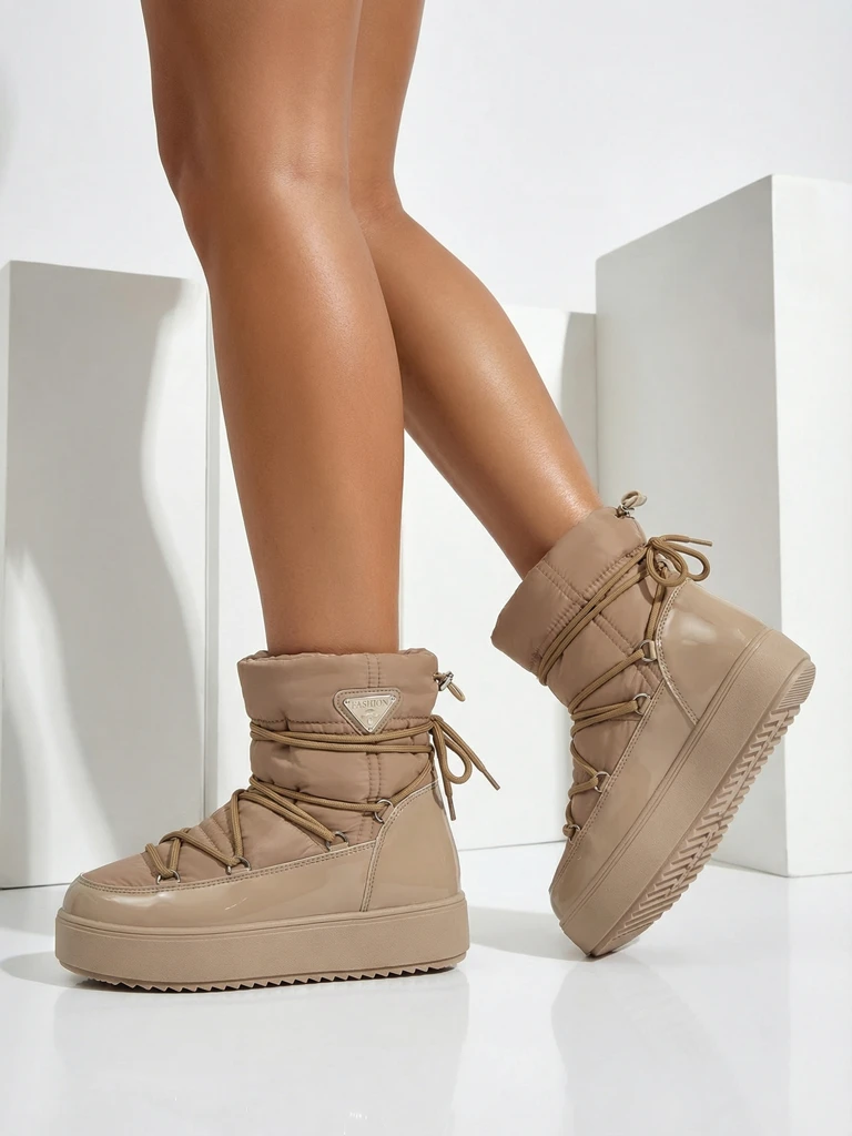 - Ghete de zăpadă pentru femei cu partea superioară dintr-o combinație de material din pânză și piele ecologică. În interior este căptușit cu blană plăcută, încălțăminte tip slip-on și cu șireturi. Perfecte pentru iarnă!