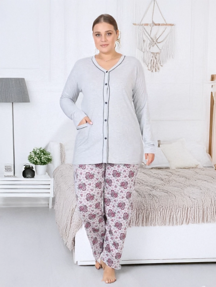 - Pijama pentru femei, 2 piese, din bumbac cu un imprimeu decorativ. Setul include o cămașă cu mâneci lungi, închidere cu nasturi și pantaloni cu talie elastică și picioare drepte.
