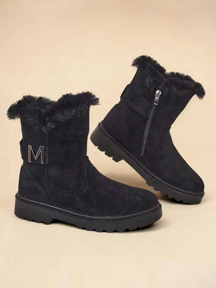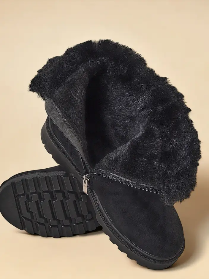 - Cizme de iarnă grozave pentru femei, în stil de cizme de zăpadă cu toc plat. Partea superioară este din piele de suede ecologic, iar interiorul este căptușit cu blană. Încălțămintea se închide cu fermoar. O bază perfectă pentru iarnă!