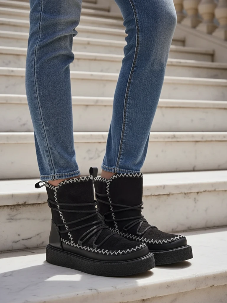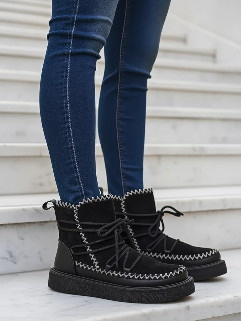 - Cizme de zăpadă pentru femei cu partea superioară din piele întoarsă ecologică. Căptușeală delicată în interior, încălțăminte cu șireturi. Perfecte pentru iarnă!
