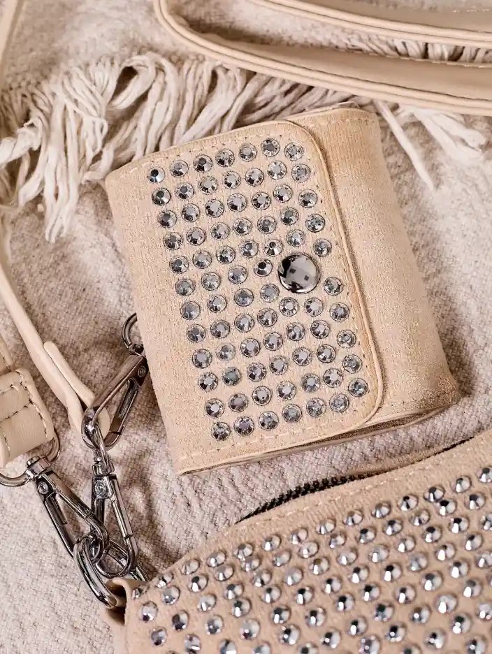 - Geantă mică elegantă de damă decorată cu studuri. Model cu închidere cu fermoar, are 1 compartiment și 2 buzunare. Geanta are două curele detachable și un portofel decorativ. Ideală pentru ieșiri oficiale!
