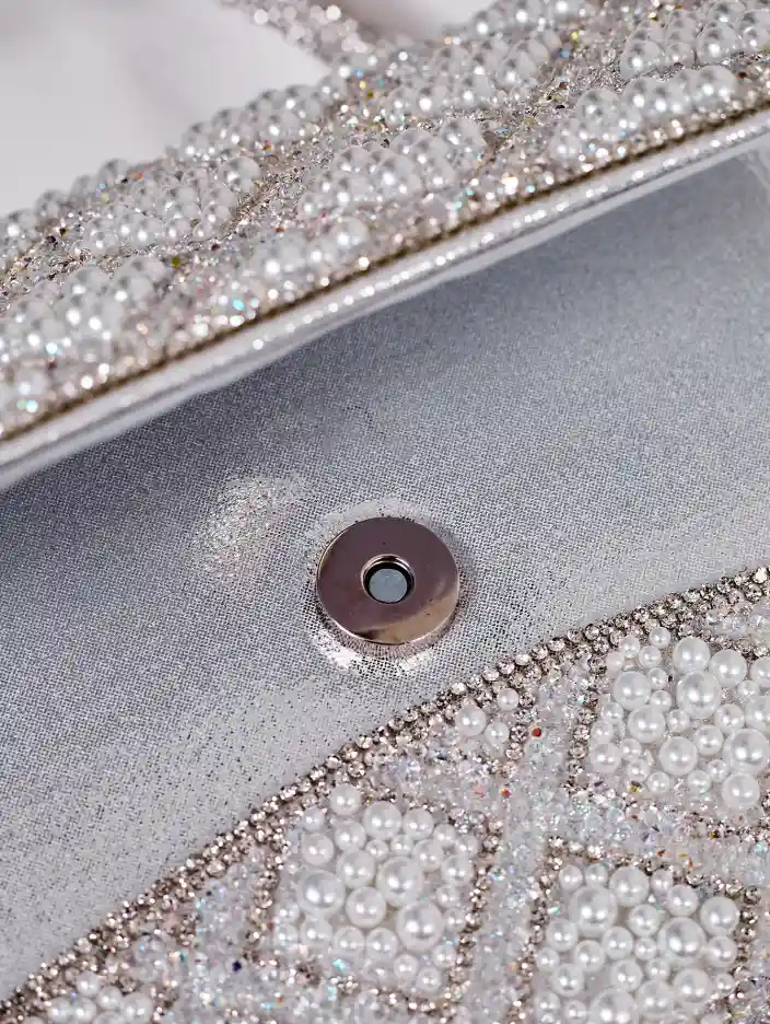 - Geantă mică elegantă pentru femei decorată cu zirconii și perle. Model cu închidere magnetică, are 1 compartiment și 1 buzunar, mânere și o curea pentru umăr. Perfectă pentru ieșiri oficiale!