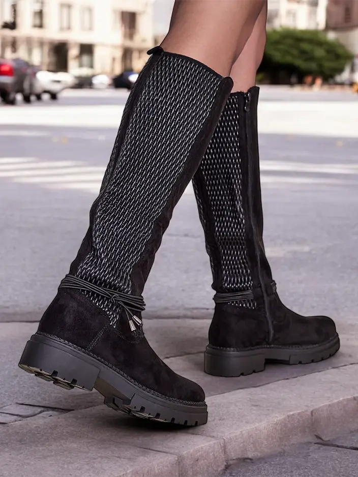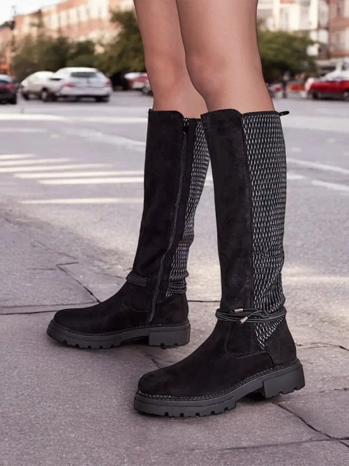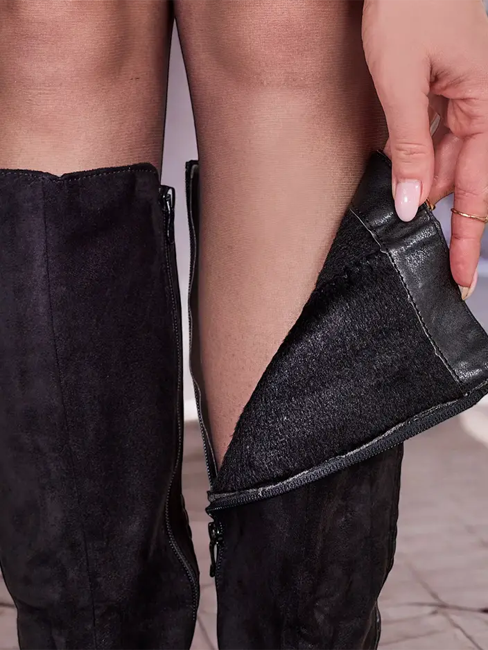 • Cizme înalte pentru femei din piele ecologică de suede cu un toc plat. La interior cu o branț din blană. Modelul se încheie cu un fermoar și are un inserție elastică în spate. Elegant și stylish cu o decorație detașabilă!