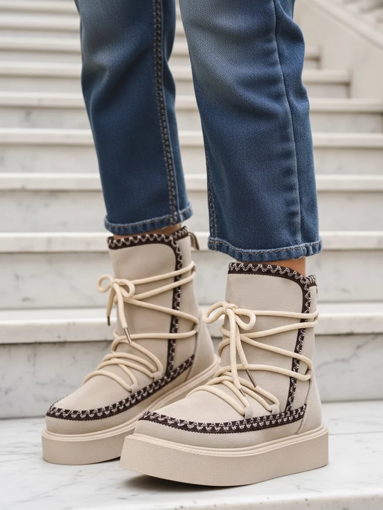 • Botine de zăpadă pentru femei cu un superior din piele ecologică de suede. În interior, există o captuseală delicată, iar botinele sunt legate. Perfecte pentru iarnă!