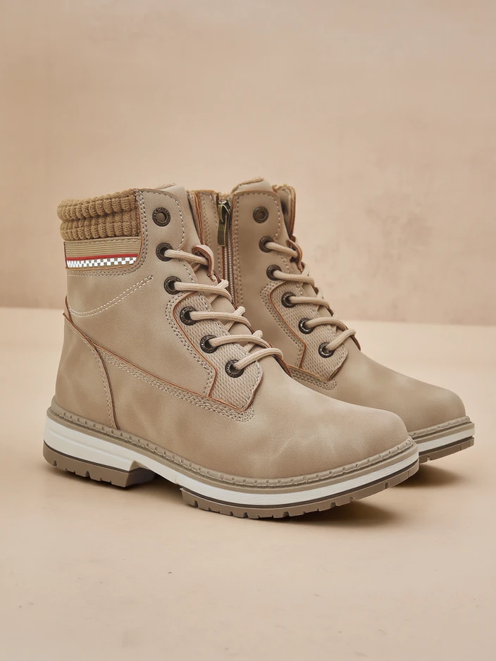 - Botine de trekking pentru femei cu șireturi și fermoar pe lateral. Materialul este din eco-piele. Interiorul pantofilor este căptușit cu blană. Perfecte pentru sezonul rece!