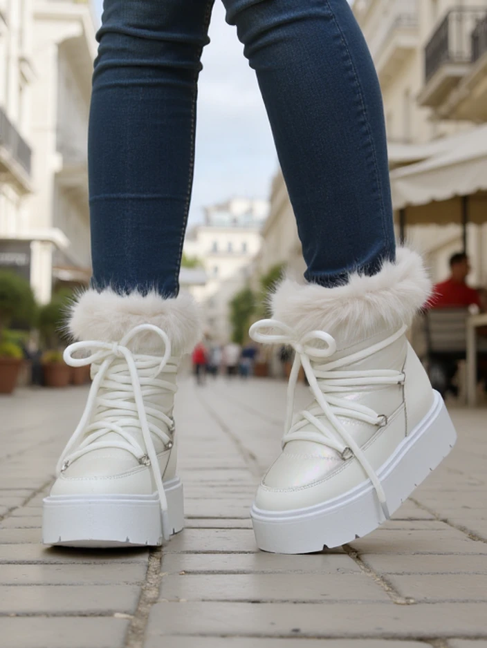 - Încălțăminte de zăpadă pentru femei cu un șut dintr-o combinație de țesătură asemănătoare tarpaulinului și ecou-piele. În interior există blană plăcută, încălțămintea este ușor de purtat și șireturile. Perfectă pentru iarnă!