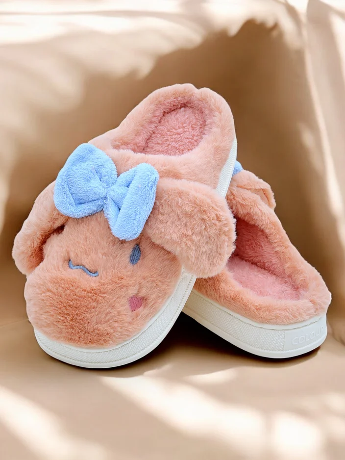 - Papuci uimitori pentru femei, cu talpă plată, împodobiți cu o fundiță. Modelul este realizat din materiale care imită blana. O opțiune grozavă pentru ținutele de acasă!