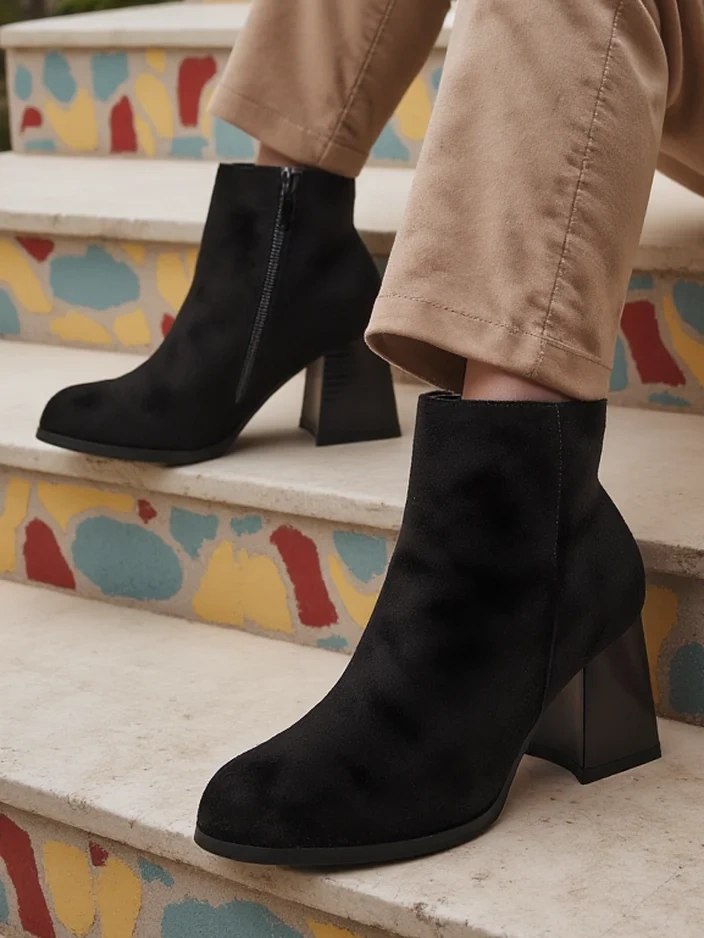 - Cizme de gleznă uimitoare pentru femei cu toc mic, fabricate din piele ecologică de suede. Modelul dispune de o branț din material textil și se închide cu un fermoar. Perfecte pentru ținutele de toamnă!