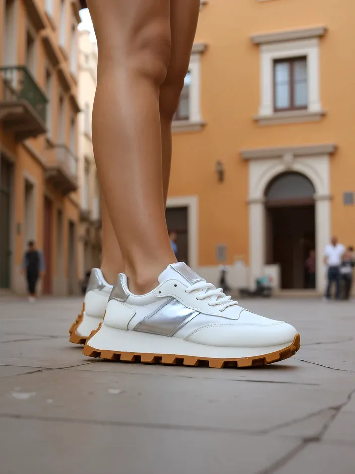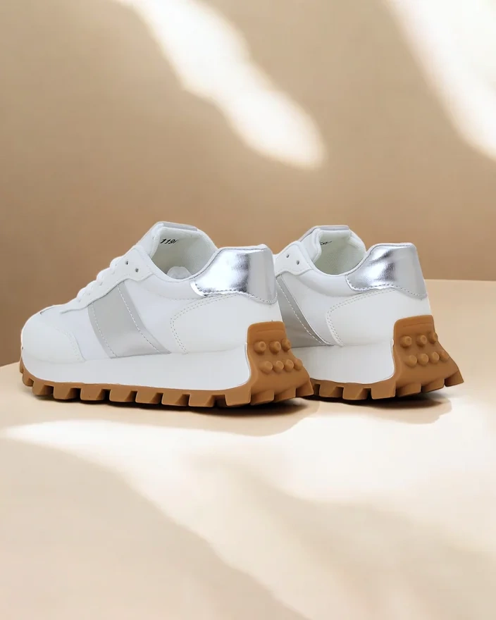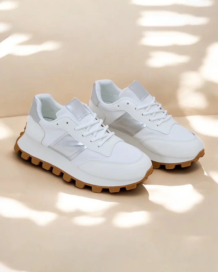 - Pantofii sport pentru femei cu talpă plată, realizați dintr-o combinație de eco-piele lucioasă, nubuc ecologic și elemente din țesătură, sunt amestecul perfect de stil și confort. Modelul dispune de o talpă interioară din material textil. Ideali pentru pe