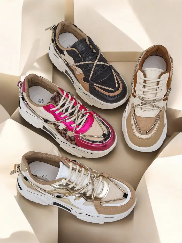 • Pantofi sport pentru femei cu talpă plată, o combinație perfectă de stil și confort. Încălțăminte din eco-piele. Model cu șireturi cu dantelă decorativă prezentând pietricele. Ideal pentru persoanele active!