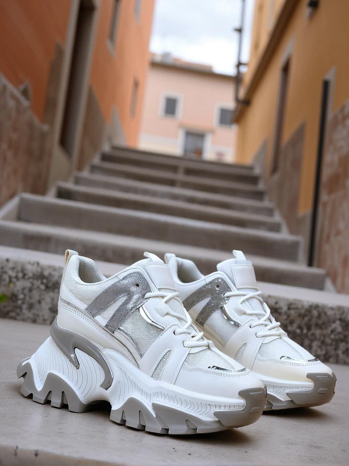 - Sneakers pentru femei cu platformă. Pantofii sunt confecționați din eco-piele cu inserții de glitter și o branț din material textil. O adiție grozavă la ținutele tale casual zilnice!