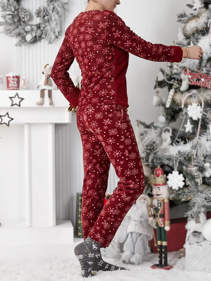 - Pijamale pentru femei, din 2 piese, cu mâneci lungi și pantaloni lungi, fabricate din material asemănător fleece. Modelul este decorat cu un imprimeu. Perfecte pentru seri confortabile acasă! NOTĂ: Precizia măsurătorii (+/-) 1 cm.