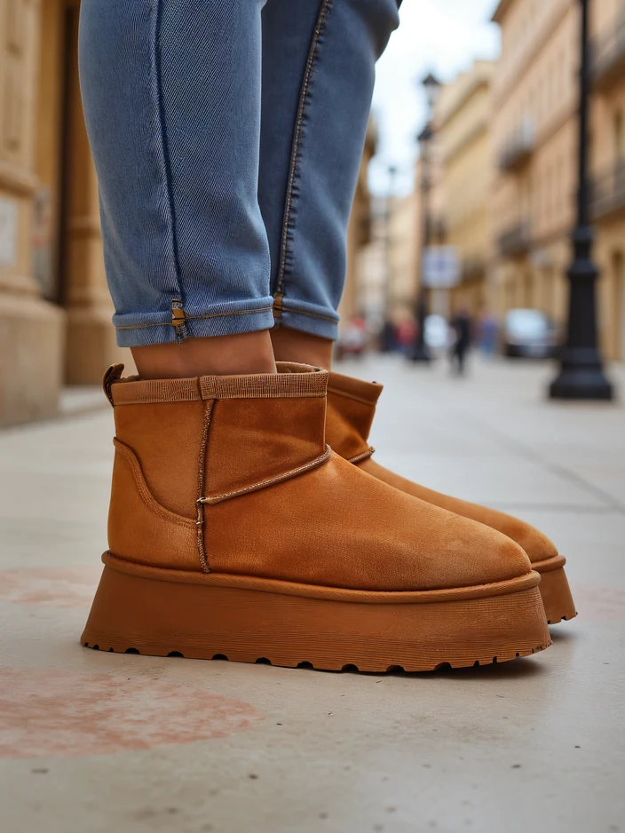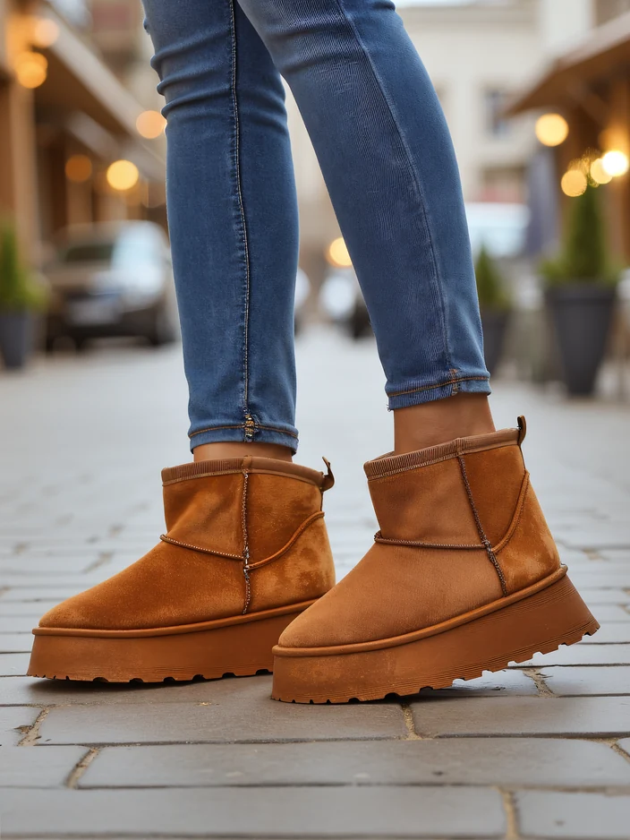 • Cizme de iarnă excelente în stilul cizmelor de zăpadă, pe o platformă. Partea superioară este din piele ecologică de suede, iar interiorul este izolat cu blană. O bază ideală pentru iarnă!