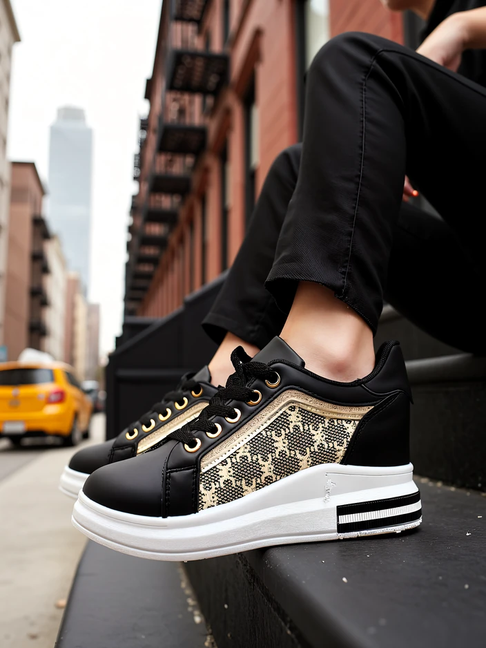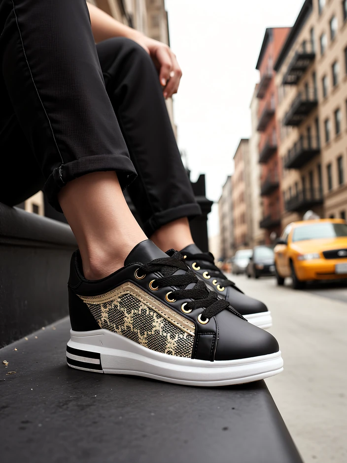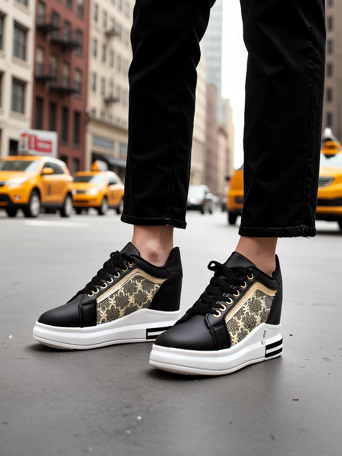 - Pantofi sport confortabili pentru femei cu toc ascuns, realizați din eco piele și țesătură cu imprimeu. Model legat cu sireturi, brant din material textil. Partea superioară elastică se va adapta ușor la picior. O adiție super stylish!