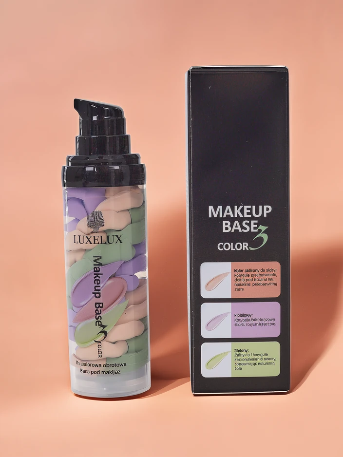 - Baza de machiaj tri-color ascunde eficient imperfecțiunile! Rozul luminează pielea, eliminând aspectul tern, verdele maschează roșeața, acneea și porii dilatați, iar violetul neutralizează tonurile galbene.