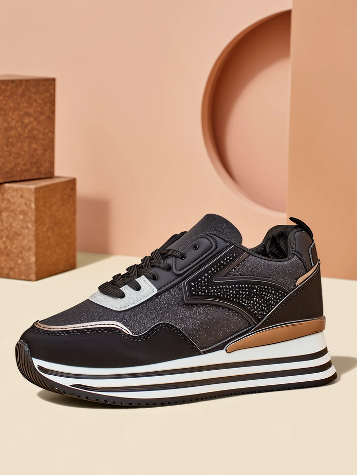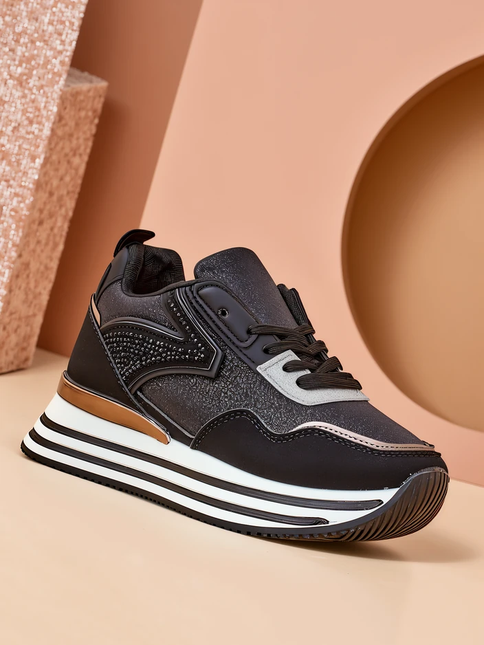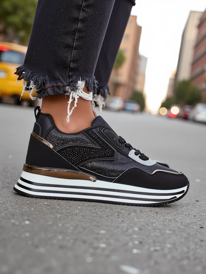 - Încălțăminte sport pentru femei în stil sneaker cu o talpă mai groasă. Fabricate din eco-piele și material sclipitor cu branț din țesătură. O adăugare minunată la ținutele tale casual de zi cu zi!