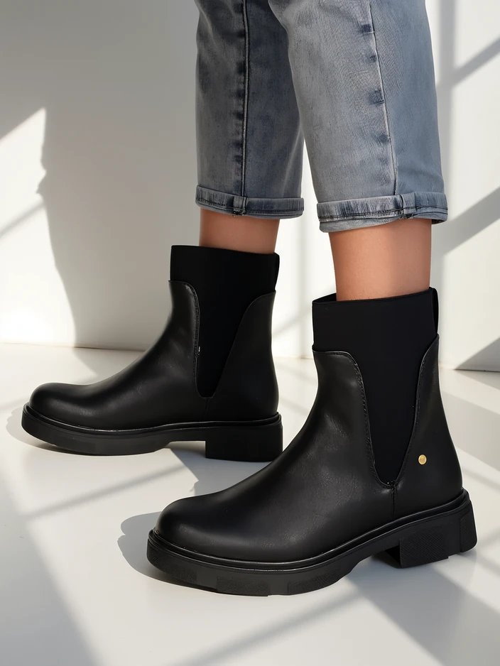 - Cizme de gleznă pentru femei uimitoare, cu toc plat, din piele ecologică. Interiorul este realizat dintr-o branț din material textil. Inserții elastice pe părțile laterale asigură o potrivire perfectă!