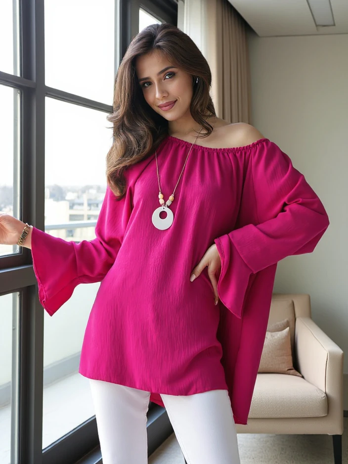 • O bluză excepțională pentru femei în stil spaniol, realizată dintr-un material moale și plăcut. Are un decolteu rotund cu elastic și mâneci decorate cu volanase. În plus, un colier este inclus în set. Perfectă pentru purtare zilnică, dar și pentru ocazii