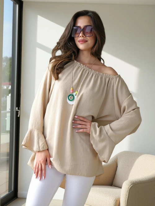- O bluză excepțională pentru femei în stil spaniol, realizată dintr-un material moale și plăcut. Are un decolteu rotund cu elastic și mâneci decorate cu volanase. În plus, un colier este inclus în set. Perfectă pentru purtare zilnică, dar și pentru ocazii
