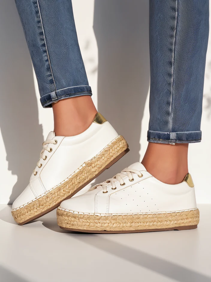 - Sportowe sneakersy damskie na płaskiej podeszwie, wykonane z tkaninowej cholewki. Model posiada eko skórzaną wkładkę oraz podeszwę zdobiona jutowym sznurkiem. Załóż je do szerokich spodni i koszuli!