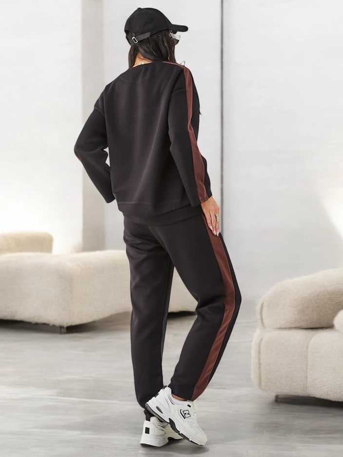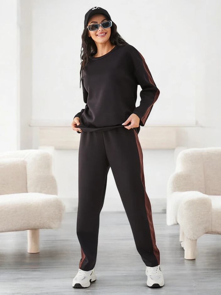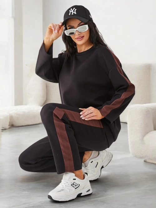 - Setul de training pentru femei este confecționat dintr-un material plăcut. Hanoracul se trage pe cap, are mâneci lungi și decolteu rotund. Pantaloni drepți cu 2 buzunare ascunse și talie elastică. Ideal pentru cei care apreciază confortul.