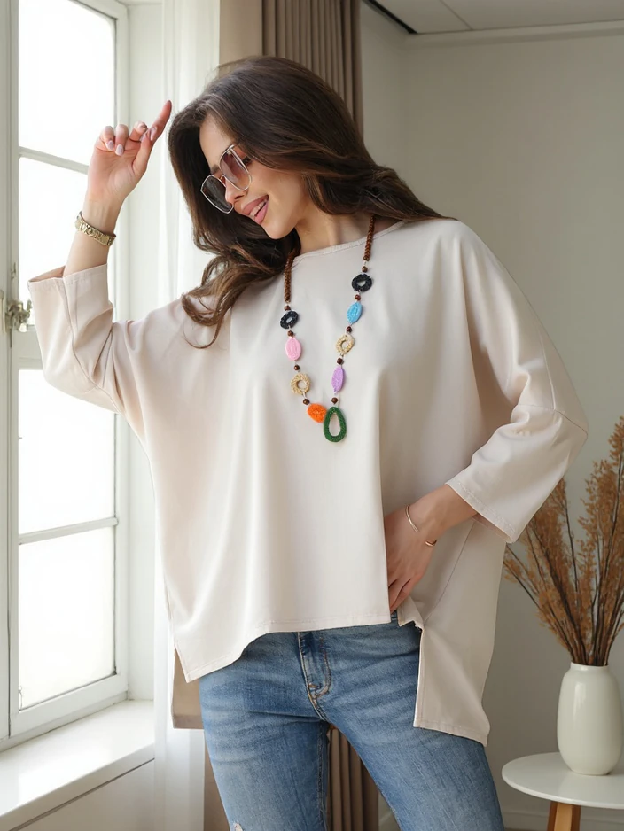 - Bluză originală pentru femei cu decolteu rotund, fabricată dintr-un material plăcut și moale. Acest produs are o croială lejeră și are mâneci de lungime 3/4. În plus, un colier este inclus în set. O alegere ideală pentru a crea ținute elegante!