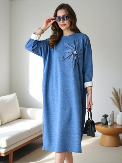 - Rochie midi pentru femei oversized, cu mâneci lungi și guler rotund. În plus, o floare decorativă. O piesă vestimentară indispensabilă în acest sezon! NOTĂ: Precizie a măsurătorilor (+/-) 1 cm. Dimensiunile măsurate plat.