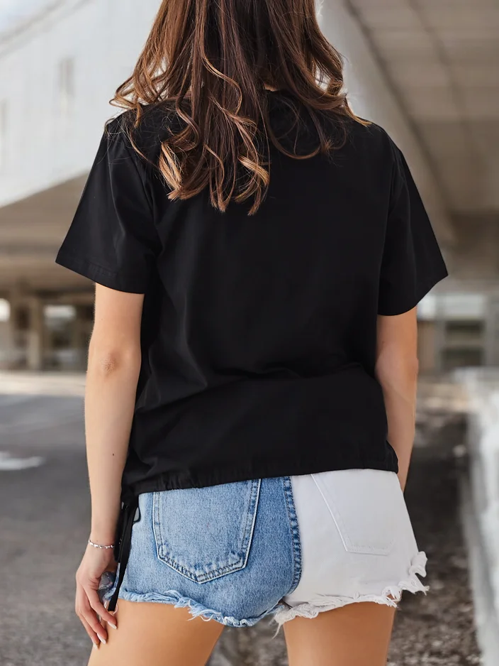 - Bluză originală pentru femei cu decolteu rotund, confecționată dintr-un material moale și plăcut la atingere. Întreaga piesă este decorată cu o inscripție subtilă, iar mâneca scurtă adaugă lejeritate. O alegere excelentă pentru crearea de ținute la modă ș