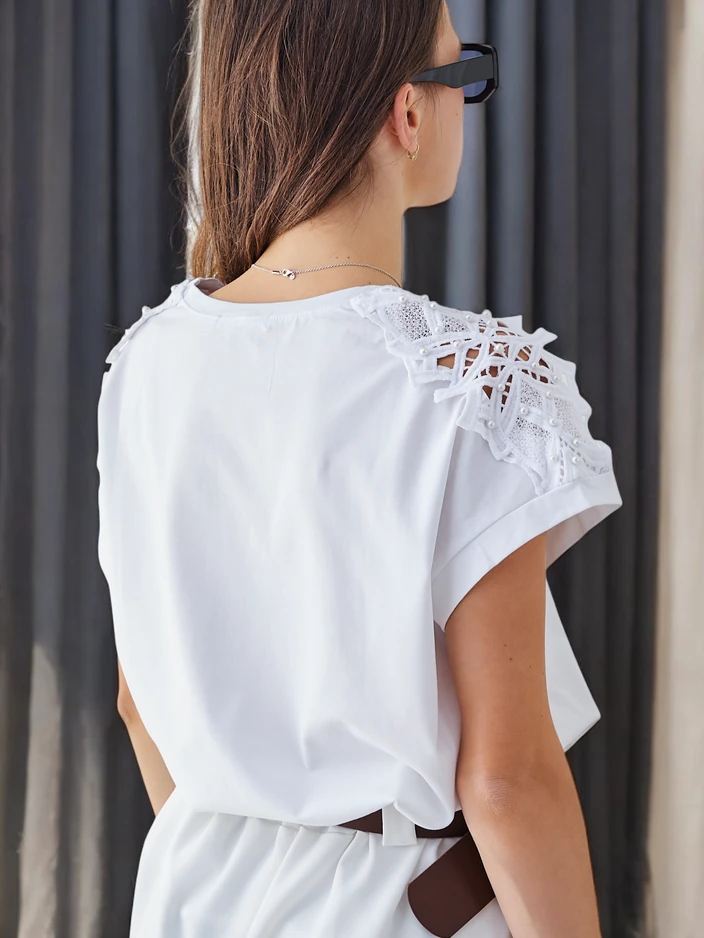 Royalfashion Tricou din bumbac pentru femei cu mâneci din dantelă