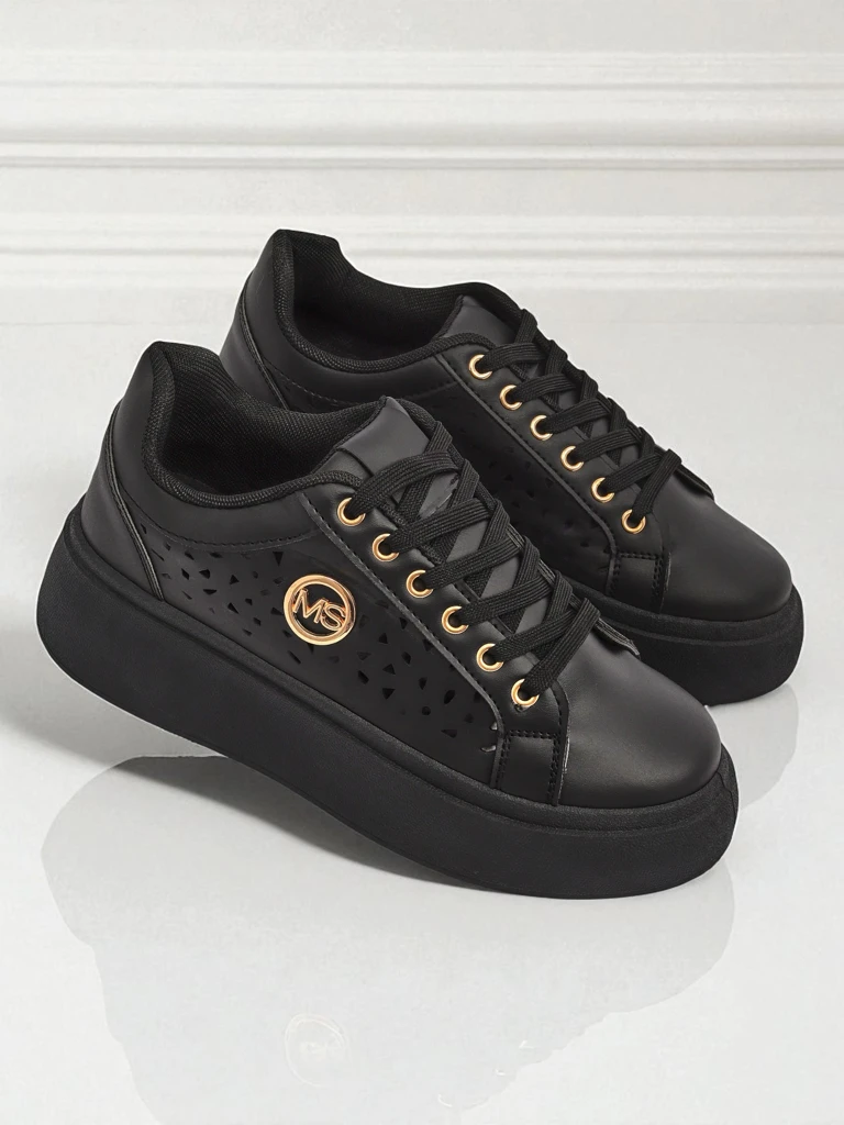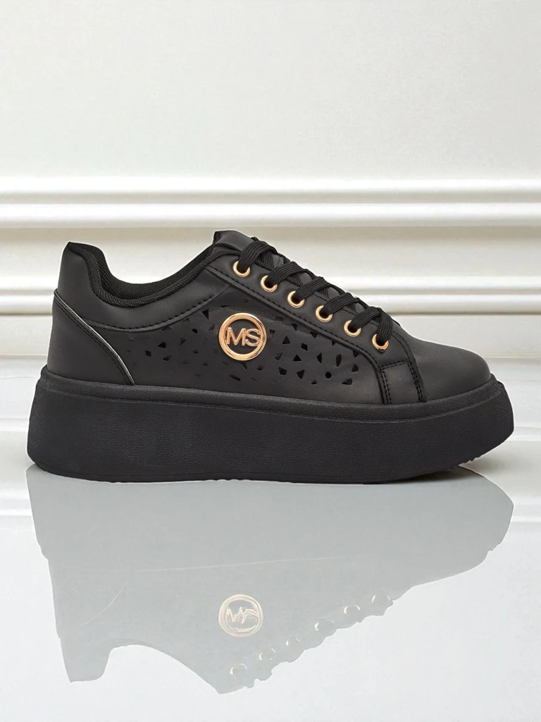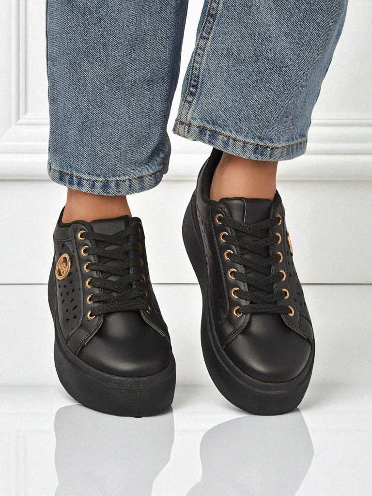 Pantofii Aurelia Nero de la Royalfashion sunt o propunere dedicată femeilor care apreciază stilul expresiv și confortul unic. Fabricat din piele ecologică de înaltă calitate, asigurând durabilitate și ușurință de îngrijire. Acesta este un model modern de adidași pe o platformă, al cărui design futurist este evidențiat de decupajele geometrice laterale și accentele aurii de la șireturi și logo. Partea superioară din piele ecologică este o soluție excelentă pentru persoanele care apreciază alegerile conștiente, având grijă atât de planetă, cât și de un aspect la modă.