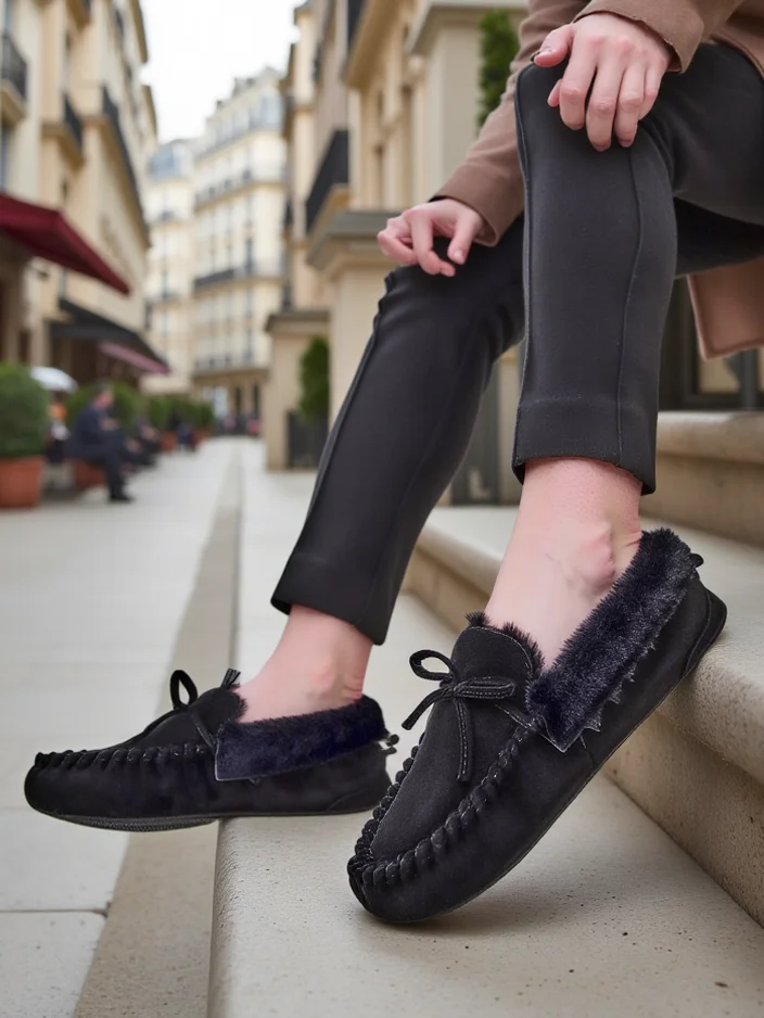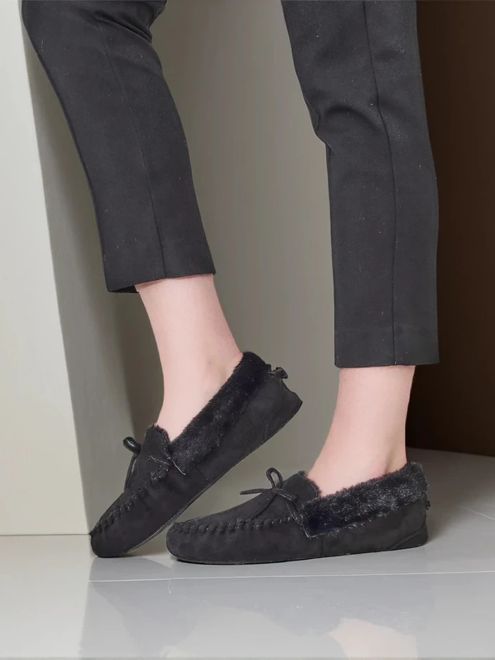 - Mocasi eleganți pentru femei cu talpă plată. Perechea este realizată din piele ecologică de nubuc. Interiorul este căptușit cu blană. Există o fundiță decorativă pe vârful pantofului. Perfecte pentru ținute casual!
