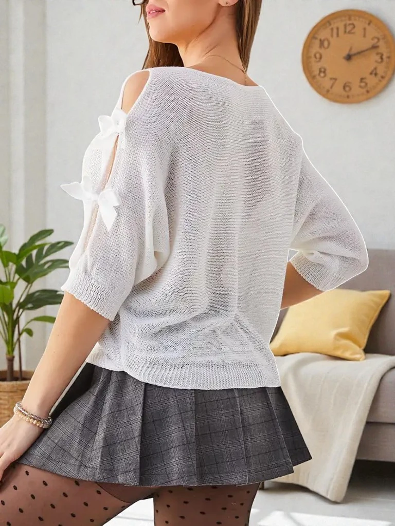 - Zmysłowy damski sweter wykonany z miękkiej tkaniny, która zapewnia komfort noszenia. Model z okrągłym dekoltem oraz rękawami 3/4. Dodatkowo zdobiony kokardkami na rękawach, dodającym uroku i kobiecości.