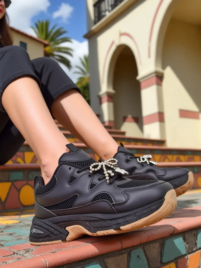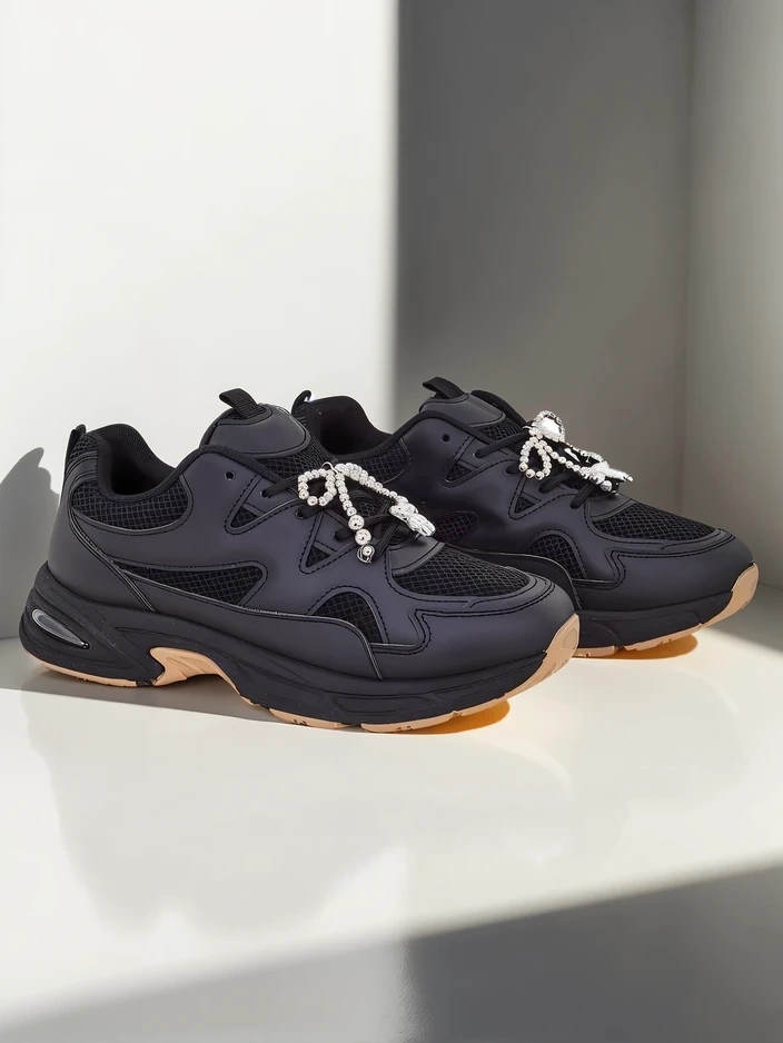 - Pantofi sport pentru femei din eco-piele și plasă. Model cu o talpă mai groasă. Partea superioară cu șireturi. Vor fi grozavi pentru ținutele de zi cu zi! Decorați cu o lanț detașabil.