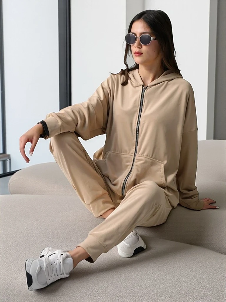 - Set de velur pentru femei realizat dintr-un material plăcut. Hanorac cu fermoar. Pantaloni lungi cu talie elastică, 2 buzunare. Simți-te elegantă în acest set minunat!