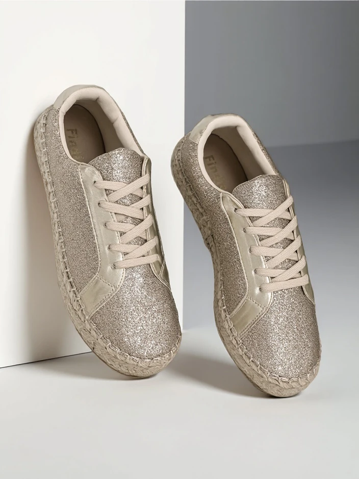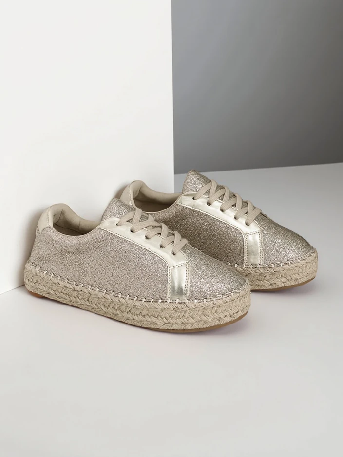 - Adidași pentru femei din material textil cu sclipici. Supratoc lănțuit. Talpă clasică din cauciuc învelită în sfoară de jută. Aceste încălțăminte va fi grozavă pentru purtarea zilnică!