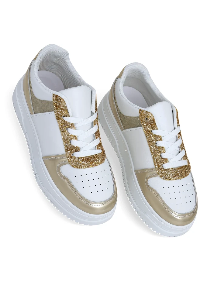 Acești sneakers sunt perfecți atât primăvara, cât și toamna, iar culoarea lor aurie adaugă strălucire oricărei ținute. Îi poți asorta cu ușurință la diferite stiluri. Iată câteva idei de ținute: