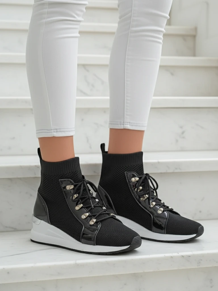 - Sneakers damă moderne, înalte, cu platformă ascunsă, confecționate din material textil. Interiorul este prevăzut cu o căptușeală moale din material textil. Pantofi slip-on. Vor fi un accesoriu excelent pentru ținutele de zi cu zi.