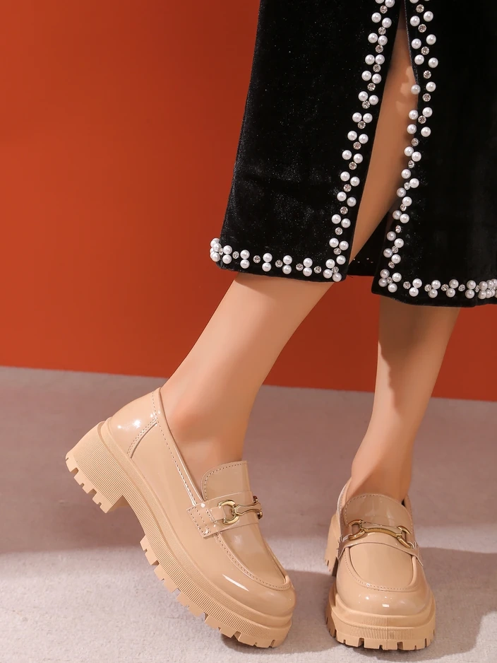 - Mocasi frumoși pentru femei cu o talpă mai groasă. Modelul este de stil casual și este realizat din piele ecologică lucioasă și o branț din piele ecologică. Partea superioară are o decorare nedetașabilă. Vârful este rotunjit. O bază ideală pentru multe ți