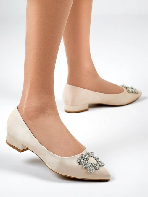 - Balerini unici dintr-un material asemănător satinului, cu vârf ascuțit. Partea superioară este decorată cu o cataramă delicată cu zirconii. Brantul moale din eco-leather oferă confort. Sunt perfecți pentru ținute elegante și la modă!