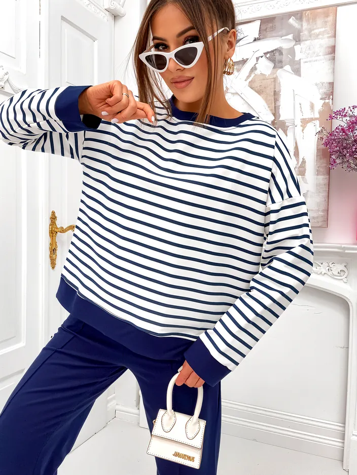 - Set de femei realizat dintr-un material plăcut cu un model în dungi. Pulover sweatshirt cu mâneci lungi și fără glugă. Pantaloni de trening cu talie elastică și 2 buzunare. O alegere ideală pentru purtarea zilnică!