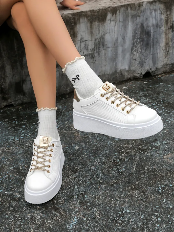 - Pantofi sport cu platformă pentru femei - o combinație perfectă între stil și confort. Încălțăminte din eco-piele. Model cu șireturi și branț din material textil. Ideal pentru oamenii activi!
