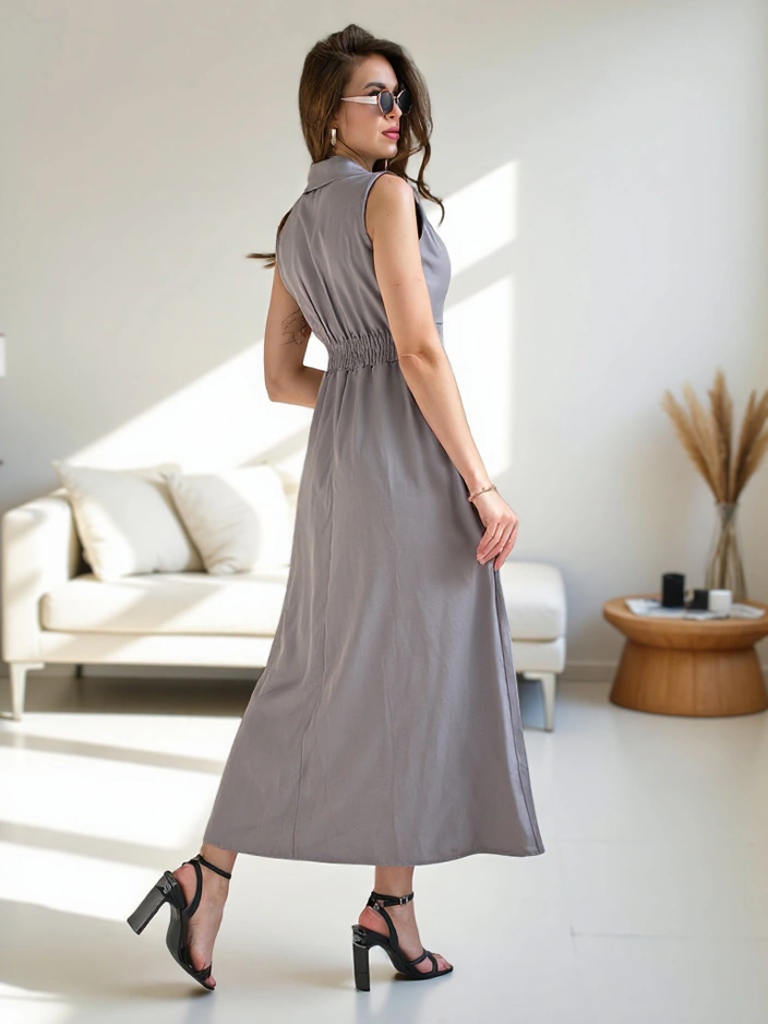 - Rochie fără mâneci pentru femei cu guler înfășurat. Modelul are un elastic în talie și o fustă fluidă. Eleganță de afaceri! OBSERVAȚIE: Precizia măsurătorii (+/-) 1 cm.
