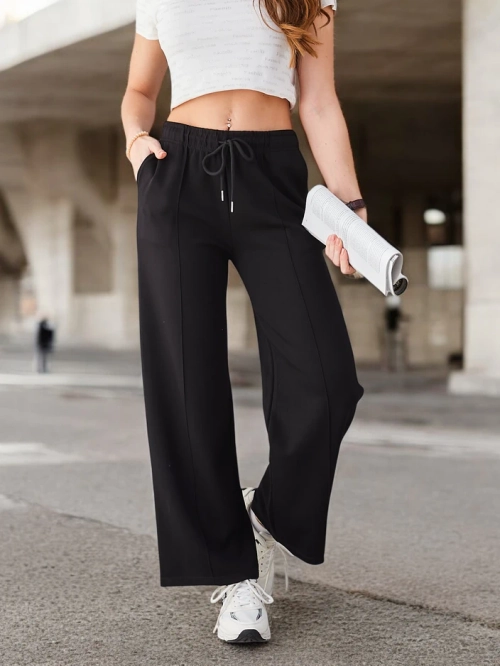 - Pantaloni largi uimitori dintr-un material ușor, modelul are 2 buzunare, o bandă elastică și șnururi la talie. Design la modă cu pliuri. Un element esențial în garderoba ta! NOTĂ: Precizia măsurătorii (+/-) 1 cm.