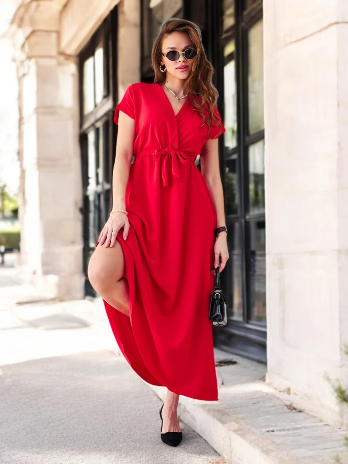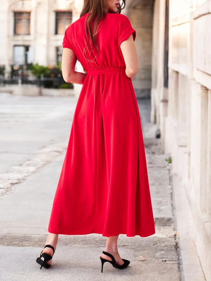 - Rochie midi pentru femei cu talie elastică. Model cu mâneci scurte, decolteu înfășurat și un centură. Un obiect esențial în garderoba ta!